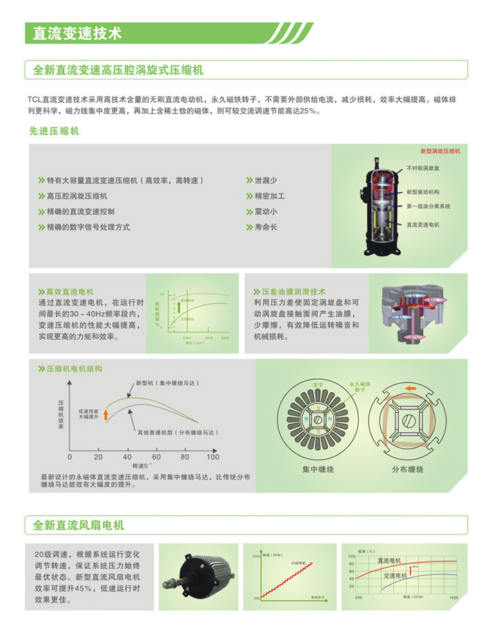 TCL直流变速技术采用高技术含量的无刷直流电动机,永久磁铁转子,不需要外部供给电流,减少损耗,效率大幅度提高。磁体排列更科学,磁力线集中度更高,再加上含稀土钕的磁体,则可较交流调速节能高达25%。特有大容量直流变速压缩机,高压腔涡旋压缩机,精确的直流变速控制,精确的数字信号处理方式。TCL钛金变频空调采用的钛金材料保证空调换热性能的长久稳定,保证空调整机的正常运行;此外TCL钛金空调采用多重参数保护设置,全方位保护空调平稳安全运行。
