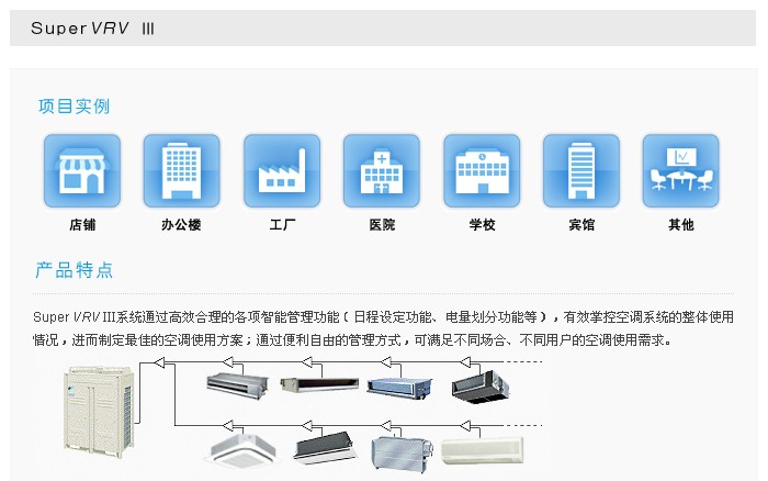 大金Super VRVⅢ系列产品,运用先进的智能化集中控制系统Intelligent-Manager,只需通用电脑进行简单操作,就可最多对1024台空调室内机实现单独/集中控制、电量划分、节能管理等智能化管理功能,通过追加选配功能,还可实现与大楼内门锁、照明、火警等设备联动,为您提供现代化楼宇空调舒适与节能的一体化解决方案。