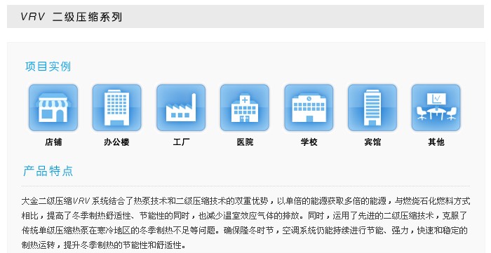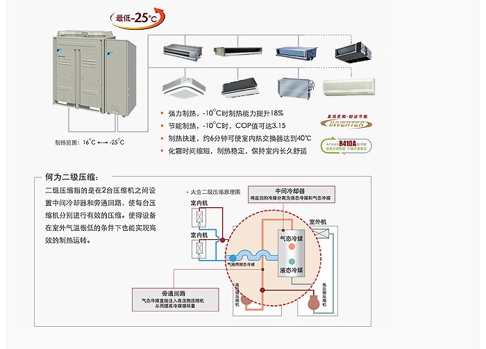 针对寒冷地区开发的VRV 二级压缩系列,运用先进的二级压缩技术,克服常见单级压缩空调系统在极寒地区制热能力不足的问题,再次创造的空气源热泵技术的新文化,为寒冷地区的客户提供了更高效节能的制热选择。