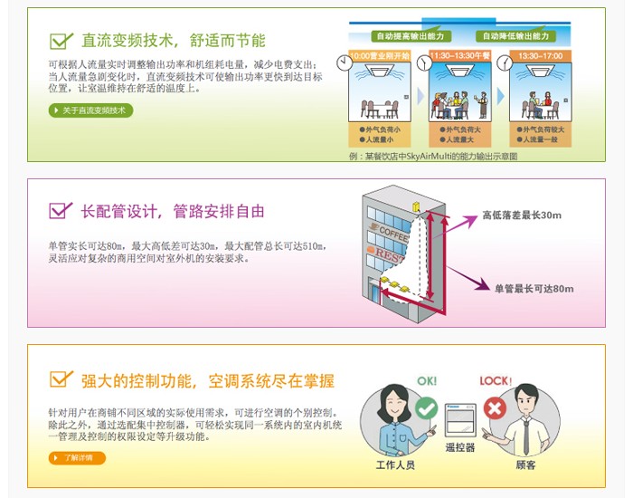 大金不断在商用空调领域推出具有革新性的产品,SkyAir Multi系列更是实现了传统商用空调的多联式升华。让您享受最好的节能性、为您节省外机摆放空间、提供最匹配的容量设计,以尖端科技打造完美商用空间。
