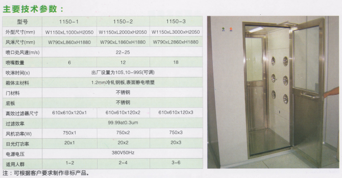 风淋室是人进入洁净室所必须的通道,它可以减少人进出洁净室所带来的污染问题。风淋室的两道门电子互锁,可以兼起气闸室的作用,防止未被净化的空气进入洁净室,降低人员出入洁净室过程中尘埃对洁净室的污染。当人员进入风淋室后,高速洁净气流经高效过滤器过滤后由可旋转喷嘴从各个方向喷射至人身上,有效而迅速清除衣着所携带的尘埃粒子单片机微处理控制器,智能语音提示系统,人在吹淋时由控制系统自动发出语音提示让人有次序的完成整个吹淋除尘过程,人性化语言提示给人一种亲切感觉显示屏可以清晰指示吹淋时间,和所处状态。吹淋时间可调,范围在软键轻触式调节开关,具有外形美观,寿命长,易清洁的优点。红外线光电自动感应开关控制吹淋,避免无人空吹