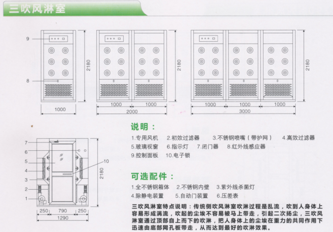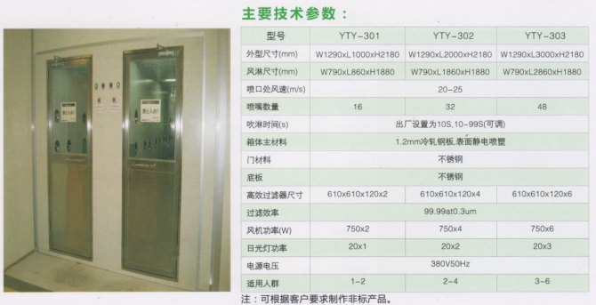 风淋室是人进入洁净室所必须的通道,它可以减少人进出洁净室所带来的污染问题。风淋室的两道门电子互锁,可以兼起气闸室的作用,防止未被净化的空气进入洁净室,降低人员出入洁净室过程中尘埃对洁净室的污染。当人员进入风淋室后,高速洁净气流经高效过滤器过滤后由可旋转喷嘴从各个方向喷射至人身上,有效而迅速清除衣着所携带的尘埃粒子单片机微处理控制器,智能语音提示系统,人在吹淋时由控制系统自动发出语音提示让人有次序的完成整个吹淋除尘过程,人性化语言提示给人一种亲切感觉显示屏可以清晰指示吹淋时间,和所处状态。吹淋时间可调,范围在软键轻触式调节开关,具有外形美观,寿命长,易清洁的优点。红外线光电自动感开关控制吹淋,避免无人空吹